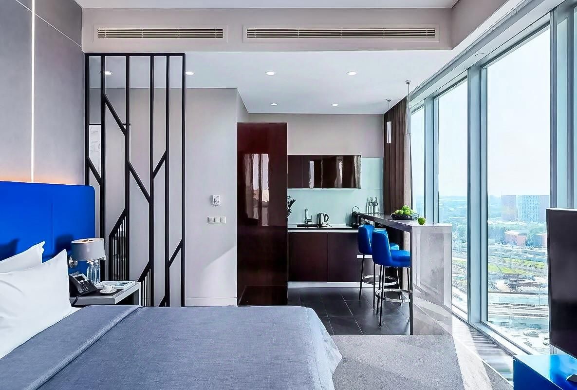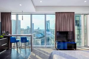 Панорамное остекление открывает захватывающие виды на столицу, наполняя пространство естественным светом и энергией.