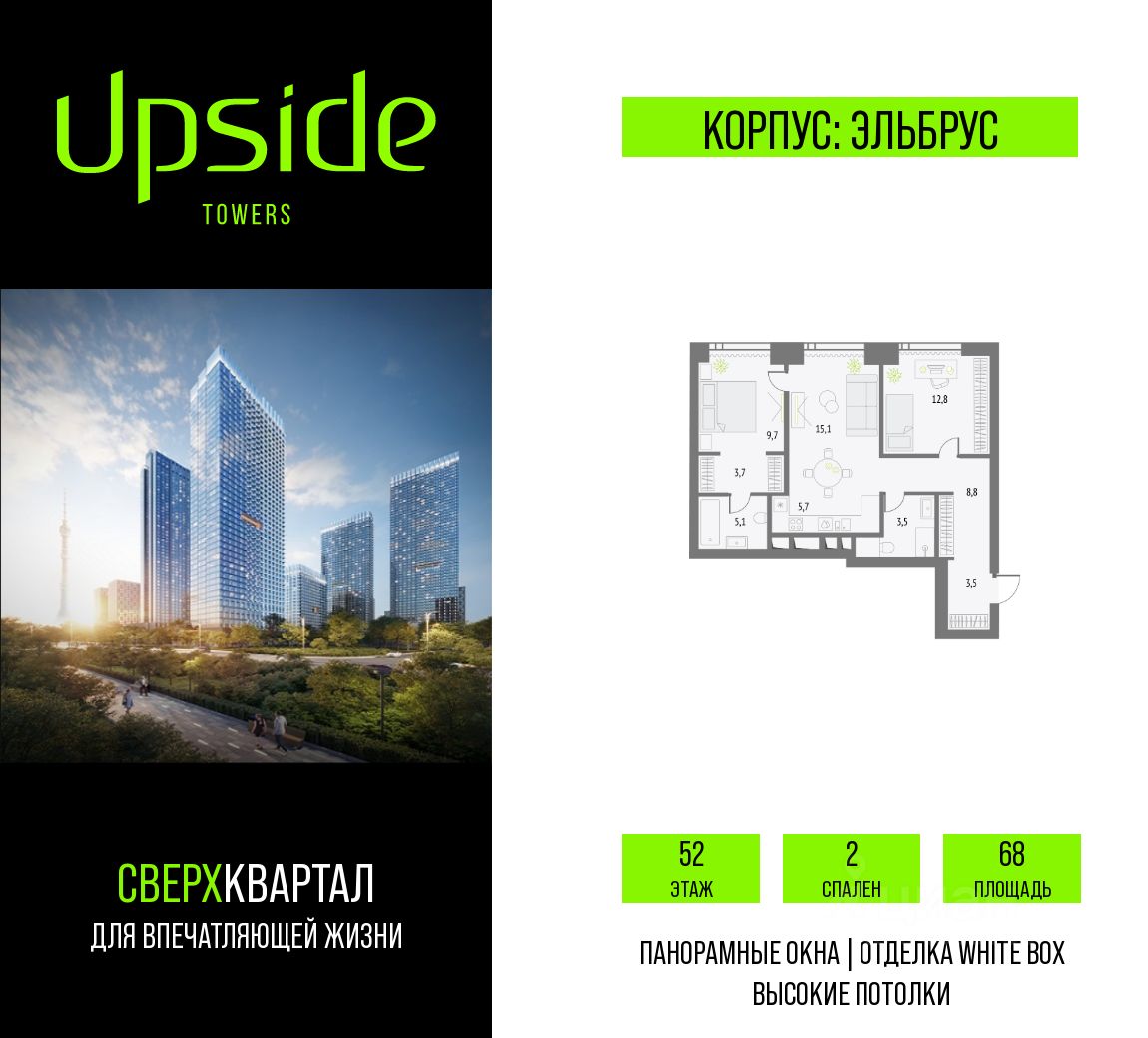 Upside Towers - технологичный квартал строится в динамично развивающемся Бутырском районе, в 3 мин. от метро, в 5 мин. от ТТК. На территории 7 га возводится 5 высотных башен от 19 до 58 этажей, названных в честь главных вершин земли. Квартиры с панорамными окнами в пол, высокими потолками и современными инженерными решениями. Благоустроенная зеленая территория включает: приватные дворы, природный комплекс, прогулочный бульвар, ландшафтный парк 2,5 га с сенсорным садом и многофункциональными игровыми и спортивными площадками.