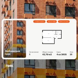 Продаётся 1-комн. квартира площадью 42,7 кв.м на 31 этаже 33 этажного дома (Корпус 14.1, Секция 1) проекта ПИК Люблинский парк. Светлый просторный подъезд на уровне земли, функциональная планировка, большие окна, c отделкой.