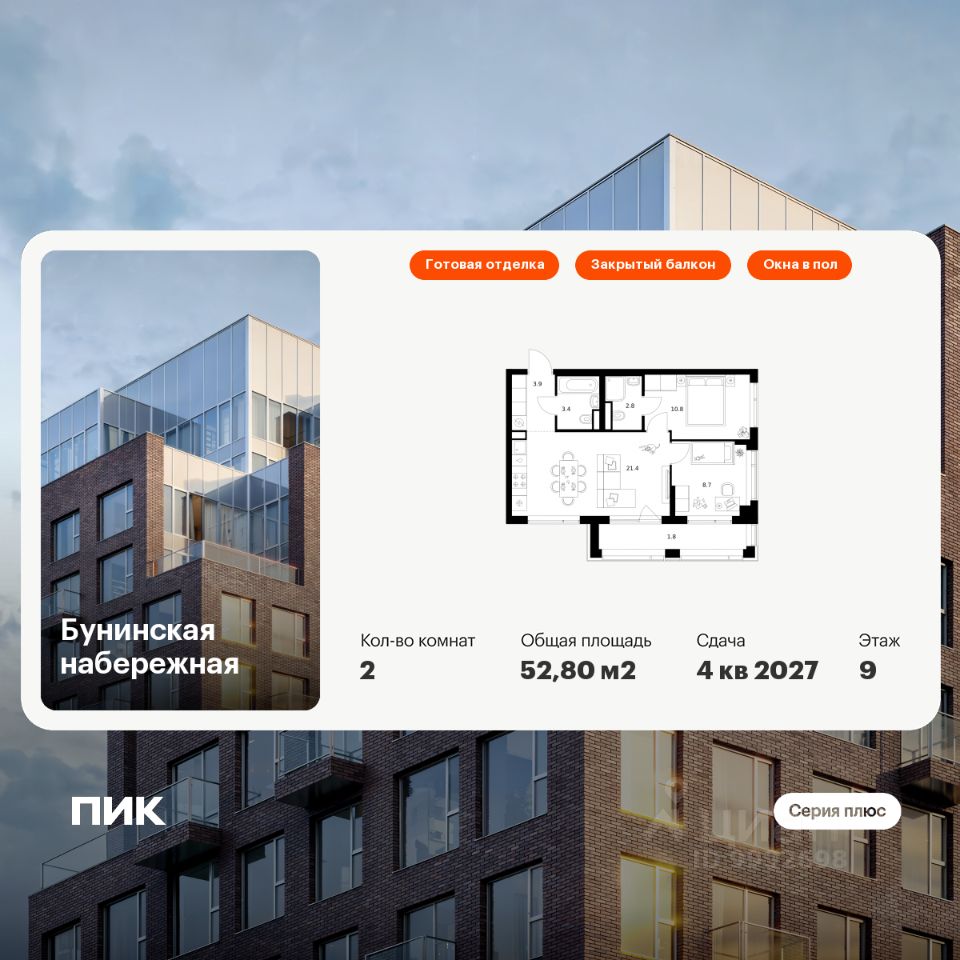 Продаётся 2-комн. квартира площадью 52,8 кв.м на 9 этаже 16 этажного дома (Корпус 2.6/1.4, Секция 4) проекта ПИК Бунинская набережная. Светлый просторный подъезд на уровне земли, функциональная планировка, большие окна, c отделкой.