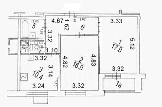 Просторная кухня площадью 10,4 кв. м. Все окна выходят во двор, жилая площадь 33 кв.м., комнаты 16 и 17 кв.м., просторная ванная комната 5 кв.м.