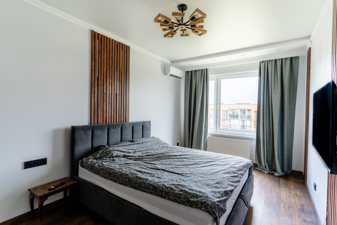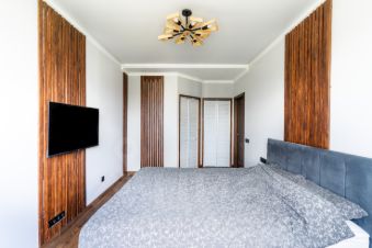 Квартира комфортной планировки с дизайнерским ремонтом и мебелью из качественных материалов. Изолированная спальня, двойная гардеробная, просторная и светлая гостиная, уютная кухня с выходом на панорамный балкон, совмещенный санузел. Просторный коридор. Окна выходят во двор. В коридоре и ванной комнате установлен тёплый пол. Будущим владельцам остается кухонный гарнитур с встроенной техникой: стиральная и посудомоечная машины (BOSH), духовой шкаф, варочная панель, вытяжка, холодильник. Остальная мебель по договоренности.
