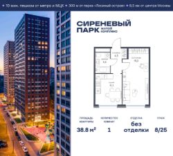 Продаётся просторная 1-комнатная квартира общей площадью 38.8 м² на 8 этаже в новом жилом комплексе "Сиреневый парк", расположенном в Восточном административном округе Москвы на улице Тагильская. Всего 10 минут ходьбы от станции метро "Бульвар Рокоссовского" и одноимённой платформы МЦК.