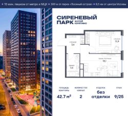 Продаётся просторная 2-комнатная квартира общей площадью 42.7 м² на 9 этаже в новом жилом комплексе "Сиреневый парк", расположенном в Восточном административном округе Москвы на улице Тагильская. Всего 10 минут ходьбы от станции метро "Бульвар Рокоссовского" и одноимённой платформы МЦК.