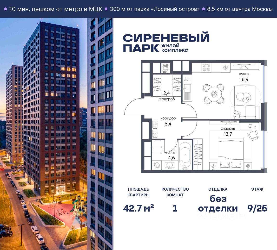 Продаётся просторная 1-комнатная квартира общей площадью 42.7 м² на 9 этаже в новом жилом комплексе "Сиреневый парк", расположенном в Восточном административном округе Москвы на улице Тагильская. Всего 10 минут ходьбы от станции метро "Бульвар Рокоссовского" и одноимённой платформы МЦК.