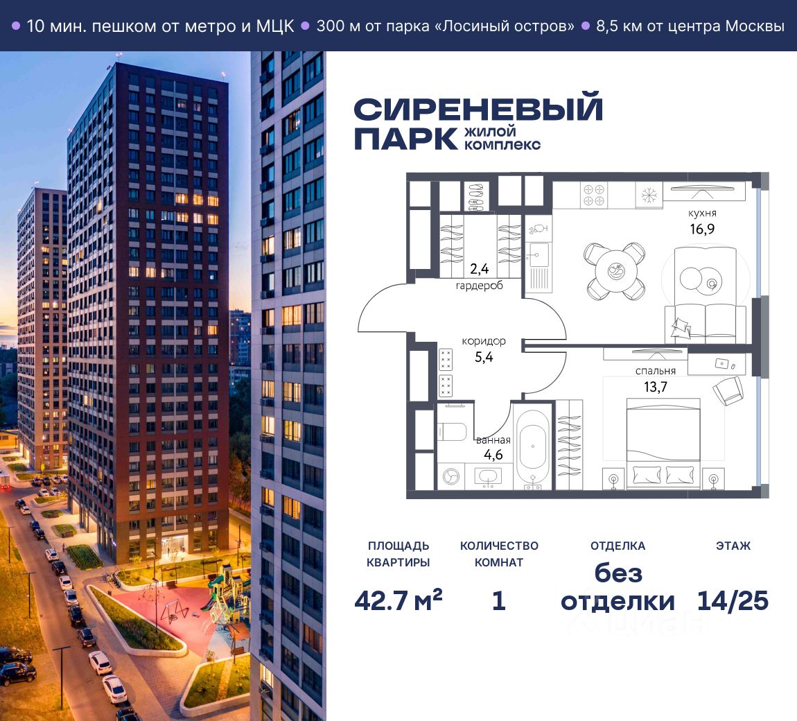 Продаётся просторная 1-комнатная квартира общей площадью 42.7 м² на 14 этаже в новом жилом комплексе "Сиреневый парк", расположенном в Восточном административном округе Москвы на улице Тагильская. Всего 10 минут ходьбы от станции метро "Бульвар Рокоссовского" и одноимённой платформы МЦК.
