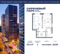 Продаётся просторная 1-комнатная квартира общей площадью 39.6 м² на 22 этаже в новом жилом комплексе "Сиреневый парк", расположенном в Восточном административном округе Москвы на улице Тагильская. Всего 10 минут ходьбы от станции метро "Бульвар Рокоссовского" и одноимённой платформы МЦК.