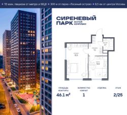 Продаётся просторная 1-комнатная квартира общей площадью 46.1 м² на 2 этаже в новом жилом комплексе "Сиреневый парк", расположенном в Восточном административном округе Москвы на улице Тагильская. Всего 10 минут ходьбы от станции метро "Бульвар Рокоссовского" и одноимённой платформы МЦК.