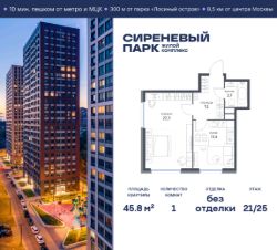 Продаётся просторная 1-комнатная квартира общей площадью 45.8 м² на 21 этаже в новом жилом комплексе "Сиреневый парк", расположенном в Восточном административном округе Москвы на улице Тагильская. Всего 10 минут ходьбы от станции метро "Бульвар Рокоссовского" и одноимённой платформы МЦК.