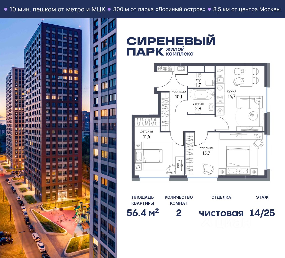 Продаётся просторная 2-комнатная квартира общей площадью 56.4 м² на 14 этаже в новом жилом комплексе "Сиреневый парк", расположенном в Восточном административном округе Москвы на улице Тагильская. Всего 10 минут ходьбы от станции метро "Бульвар Рокоссовского" и одноимённой платформы МЦК.