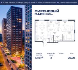 Продаётся просторная 3-комнатная квартира общей площадью 73.5 м² на 23 этаже в новом жилом комплексе "Сиреневый парк", расположенном в Восточном административном округе Москвы на улице Тагильская. Всего 10 минут ходьбы от станции метро "Бульвар Рокоссовского" и одноимённой платформы МЦК.
