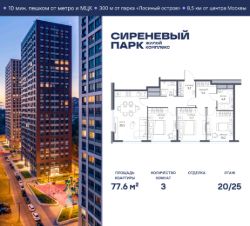 Продаётся просторная 3-комнатная квартира общей площадью 77.6 м² на 20 этаже в новом жилом комплексе "Сиреневый парк", расположенном в Восточном административном округе Москвы на улице Тагильская. Всего 10 минут ходьбы от станции метро "Бульвар Рокоссовского" и одноимённой платформы МЦК.
