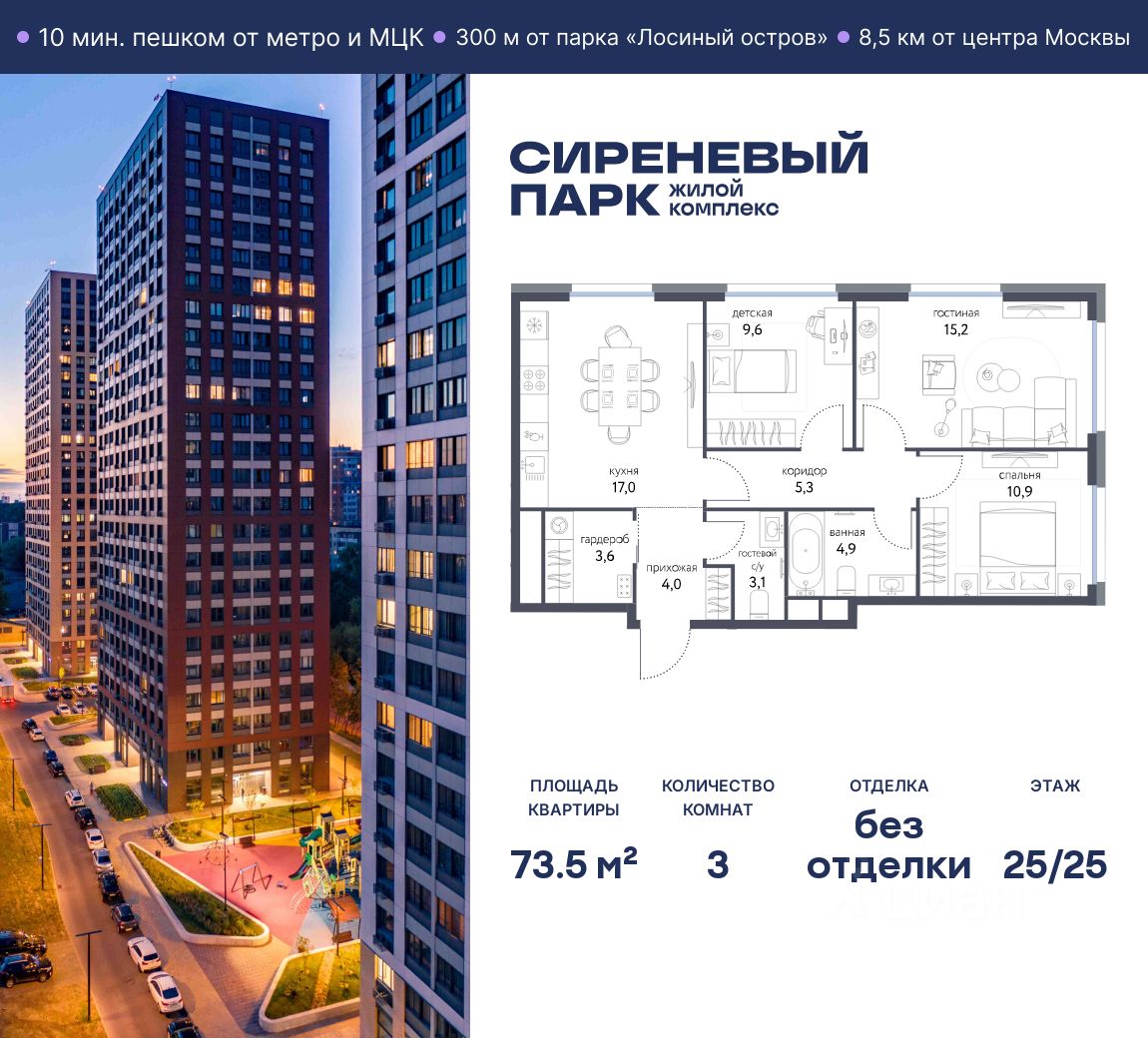 Продаётся просторная 3-комнатная квартира общей площадью 73.5 м² на 25 этаже в новом жилом комплексе "Сиреневый парк", расположенном в Восточном административном округе Москвы на улице Тагильская. Всего 10 минут ходьбы от станции метро "Бульвар Рокоссовского" и одноимённой платформы МЦК.