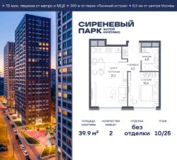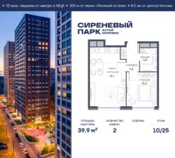 Продаётся просторная 2-комнатная квартира общей площадью 39.9 м² на 10 этаже в новом жилом комплексе "Сиреневый парк", расположенном в Восточном административном округе Москвы на улице Тагильская. Всего 10 минут ходьбы от станции метро "Бульвар Рокоссовского" и одноимённой платформы МЦК.