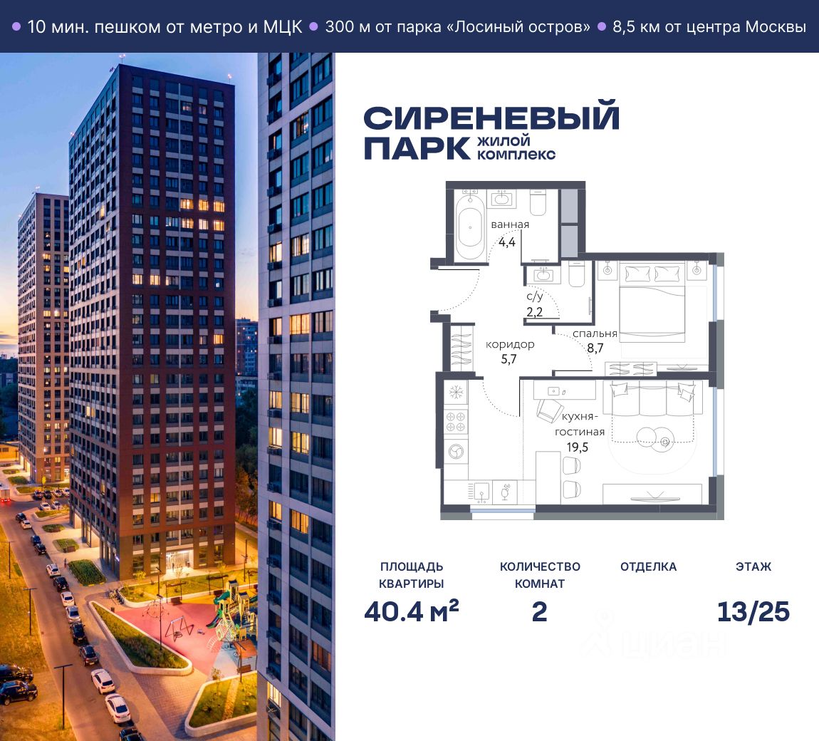 Продаётся просторная 2-комнатная квартира общей площадью 40.4 м² на 13 этаже в новом жилом комплексе "Сиреневый парк", расположенном в Восточном административном округе Москвы на улице Тагильская. Всего 10 минут ходьбы от станции метро "Бульвар Рокоссовского" и одноимённой платформы МЦК.