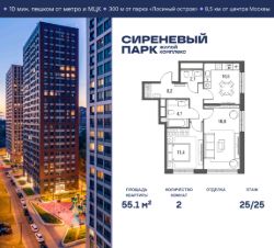 Продаётся просторная 2-комнатная квартира общей площадью 55.1 м² на 25 этаже в новом жилом комплексе "Сиреневый парк", расположенном в Восточном административном округе Москвы на улице Тагильская. Всего 10 минут ходьбы от станции метро "Бульвар Рокоссовского" и одноимённой платформы МЦК.