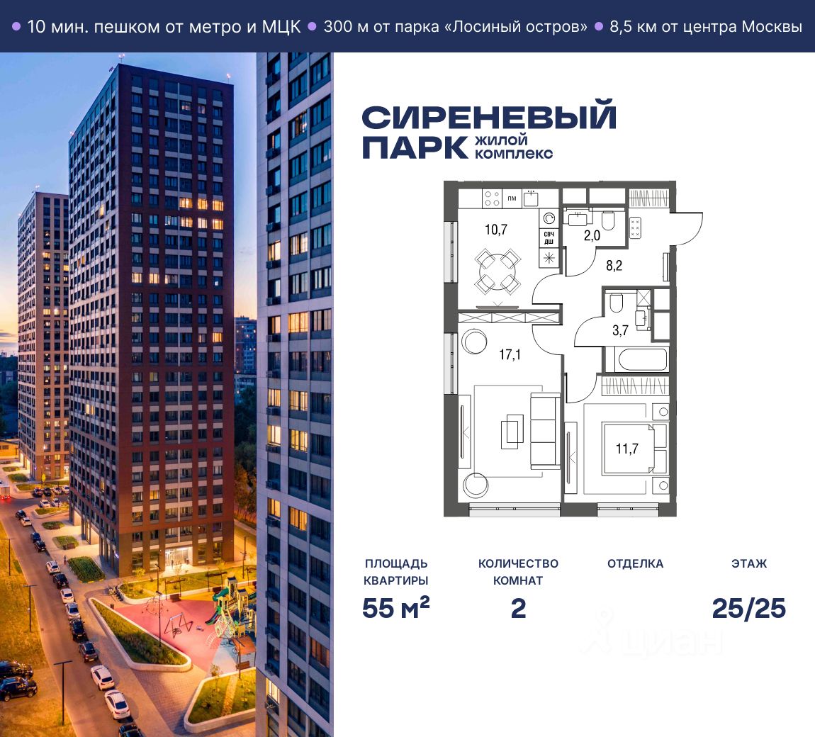 Продаётся просторная 2-комнатная квартира общей площадью 55 м² на 25 этаже в новом жилом комплексе "Сиреневый парк", расположенном в Восточном административном округе Москвы на улице Тагильская. Всего 10 минут ходьбы от станции метро "Бульвар Рокоссовского" и одноимённой платформы МЦК.
