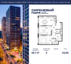 Продаётся просторная 2-комнатная квартира общей площадью 58.7 м² на 23 этаже в новом жилом комплексе "Сиреневый парк", расположенном в Восточном административном округе Москвы на улице Тагильская. Всего 10 минут ходьбы от станции метро "Бульвар Рокоссовского" и одноимённой платформы МЦК.