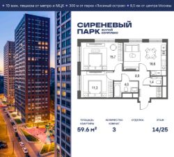 Продаётся просторная 3-комнатная квартира общей площадью 59.6 м² на 14 этаже в новом жилом комплексе "Сиреневый парк", расположенном в Восточном административном округе Москвы на улице Тагильская. Всего 10 минут ходьбы от станции метро "Бульвар Рокоссовского" и одноимённой платформы МЦК.