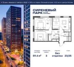 Продаётся просторная 3-комнатная квартира общей площадью 59.4 м² на 23 этаже в новом жилом комплексе "Сиреневый парк", расположенном в Восточном административном округе Москвы на улице Тагильская. Всего 10 минут ходьбы от станции метро "Бульвар Рокоссовского" и одноимённой платформы МЦК.