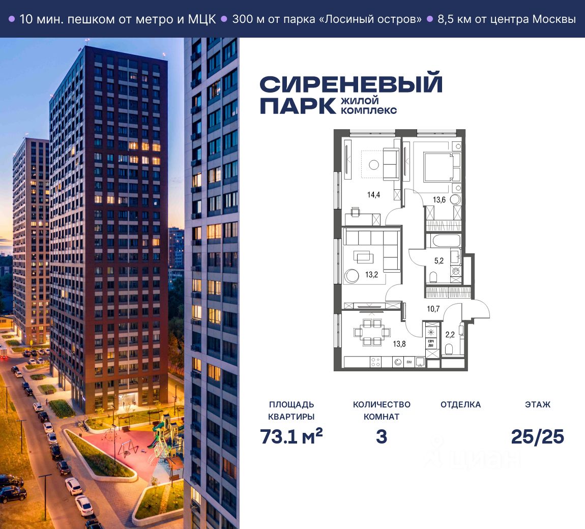 Продаётся просторная 3-комнатная квартира общей площадью 73.1 м² на 25 этаже в новом жилом комплексе "Сиреневый парк", расположенном в Восточном административном округе Москвы на улице Тагильская. Всего 10 минут ходьбы от станции метро "Бульвар Рокоссовского" и одноимённой платформы МЦК.