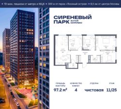 Продаётся просторная 4-комнатная квартира общей площадью 97.2 м² на 11 этаже в новом жилом комплексе "Сиреневый парк", расположенном в Восточном административном округе Москвы на улице Тагильская. Всего 10 минут ходьбы от станции метро "Бульвар Рокоссовского" и одноимённой платформы МЦК.