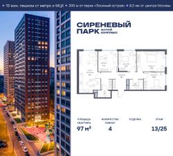 Продаётся просторная 4-комнатная квартира общей площадью 97 м² на 13 этаже в новом жилом комплексе "Сиреневый парк", расположенном в Восточном административном округе Москвы на улице Тагильская. Всего 10 минут ходьбы от станции метро "Бульвар Рокоссовского" и одноимённой платформы МЦК.