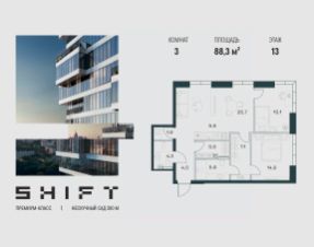 3-к квартира в премиальном комплексе SHIFT на 13-м этаже в 18 этажном здании. Общая площадь 88.3 кв. м.