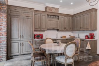- Отделка из натуральных материалов (массив дерева, травертин) в стиле американской классики;