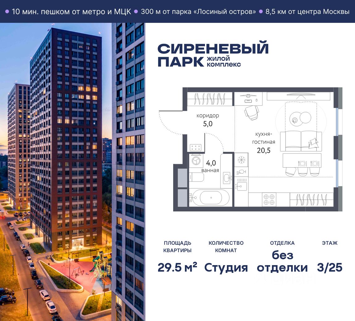 Продаётся просторная студия общей площадью 29.5 м² на 3 этаже в новом жилом комплексе "Сиреневый парк", расположенном в Восточном административном округе Москвы на улице Тагильская. Всего 10 минут ходьбы от станции метро "Бульвар Рокоссовского" и одноимённой платформы МЦК.