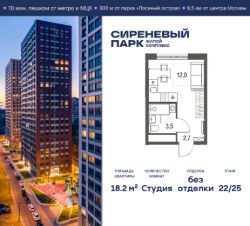 Продаётся просторная студия общей площадью 18.2 м² на 22 этаже в новом жилом комплексе "Сиреневый парк", расположенном в Восточном административном округе Москвы на улице Тагильская. Всего 10 минут ходьбы от станции метро "Бульвар Рокоссовского" и одноимённой платформы МЦК.