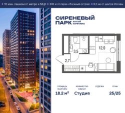 Продаётся просторная студия общей площадью 18.2 м² на 25 этаже в новом жилом комплексе "Сиреневый парк", расположенном в Восточном административном округе Москвы на улице Тагильская. Всего 10 минут ходьбы от станции метро "Бульвар Рокоссовского" и одноимённой платформы МЦК. Высококачественное монолитное строительство гарантирует сохранение тепла в доме, а наличие квартир с предчистовой и чистовой отделкой позволяет вам сэкономить время и сразу же переехать в свое жилье после покупки. Благодаря разнообразию планировок вы сможете выбрать идеальный вариант, соответствующий вашим предпочтениям и образу жизни. Предлагаются квартиры: - с просторными кухнями-гостиными, - с нишами для хранения вещей и отдельными гардеробными, - мастер-спальни с собственными санузлами, - большие комнаты с высокими потолками (2,9 м) и с увеличенными безопасными окнами (1,95 м) , которые наполнят ваш дом естественным светом; - с чистовой отделкой по двум дизайн-проектам на выбор; - с остекленными лоджиями и панорамными видами на лес. Каждая деталь в этом доме создана для вашего комфорта: - безбарьерная среда, - бесшумные скоростные лифты, - машиноместа в отапливаемом подземном паркинге и кладовые на -1 этаже с доступом из лифта, - развитая инфраструктура с супермаркетами, кафе, фитнес-клубами, салонами красоты и частным детским садом обеспечивает максимальное удобство жителям. В 300 метрах от ЖК расположен Национальный парк "Лосиный остров". Способы покупки: 100%, Trade-in, Семейная ипотека без наценки, стандартная ипотека. Запишитесь на просмотр в офис продаж и получите свою персональную скидку по акции Назови свою скидку. ЖК "Сиреневый парк" — гармония в деталях, совершенство в каждом моменте. Застройщик проекта - AFI Development.