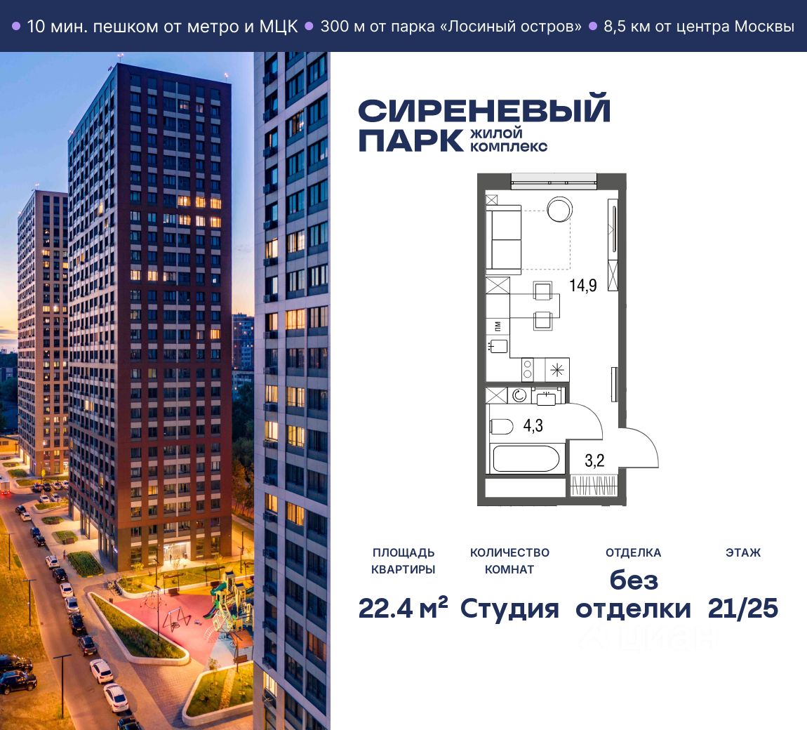 Продаётся просторная студия общей площадью 22.4 м² на 21 этаже в новом жилом комплексе "Сиреневый парк", расположенном в Восточном административном округе Москвы на улице Тагильская. Всего 10 минут ходьбы от станции метро "Бульвар Рокоссовского" и одноимённой платформы МЦК.