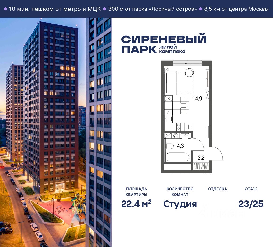 Продаётся просторная студия общей площадью 22.4 м² на 23 этаже в новом жилом комплексе "Сиреневый парк", расположенном в Восточном административном округе Москвы на улице Тагильская. Всего 10 минут ходьбы от станции метро "Бульвар Рокоссовского" и одноимённой платформы МЦК.
