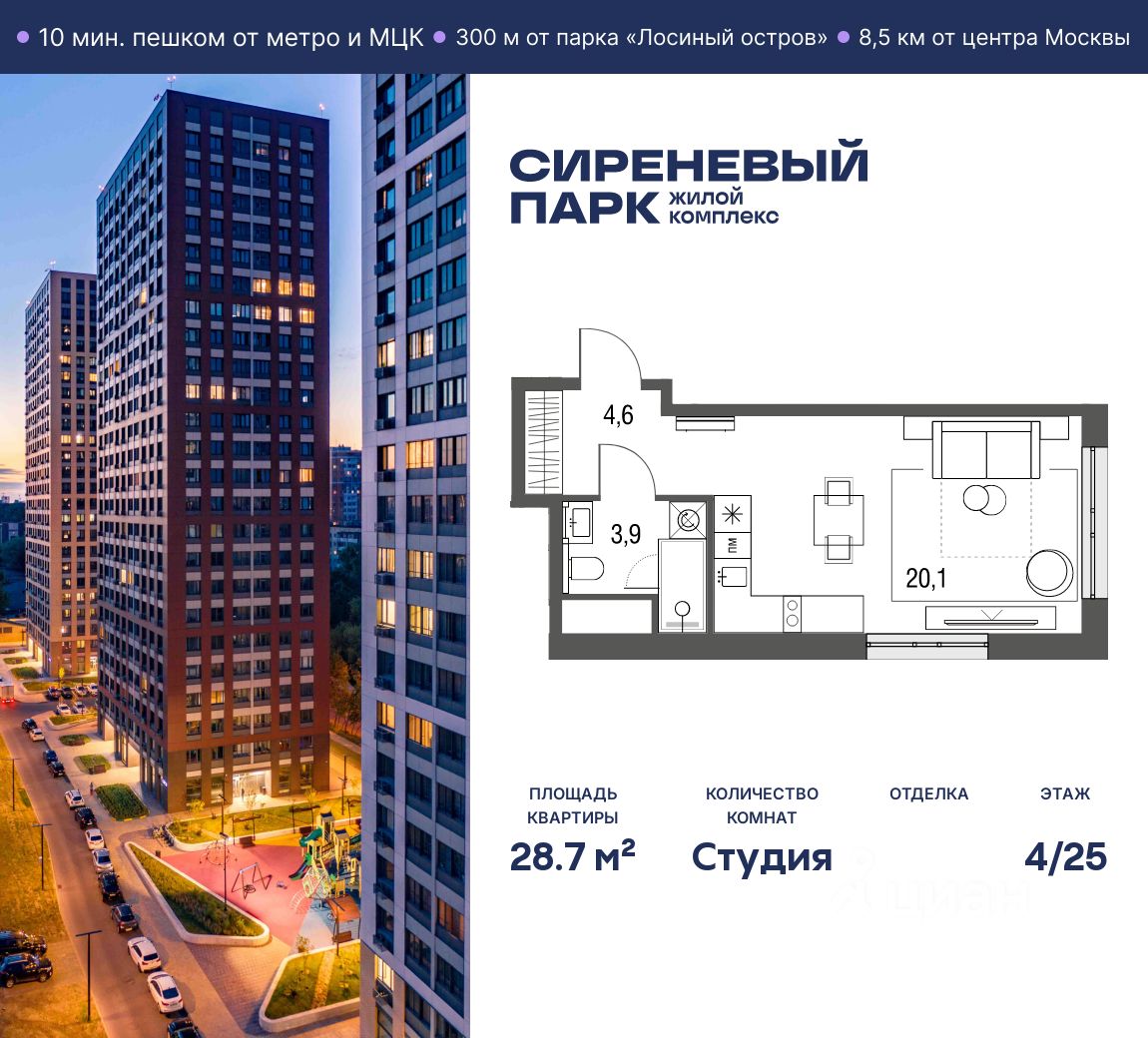 Продаётся просторная студия общей площадью 28.7 м² на 4 этаже в новом жилом комплексе "Сиреневый парк", расположенном в Восточном административном округе Москвы на улице Тагильская. Всего 10 минут ходьбы от станции метро "Бульвар Рокоссовского" и одноимённой платформы МЦК.