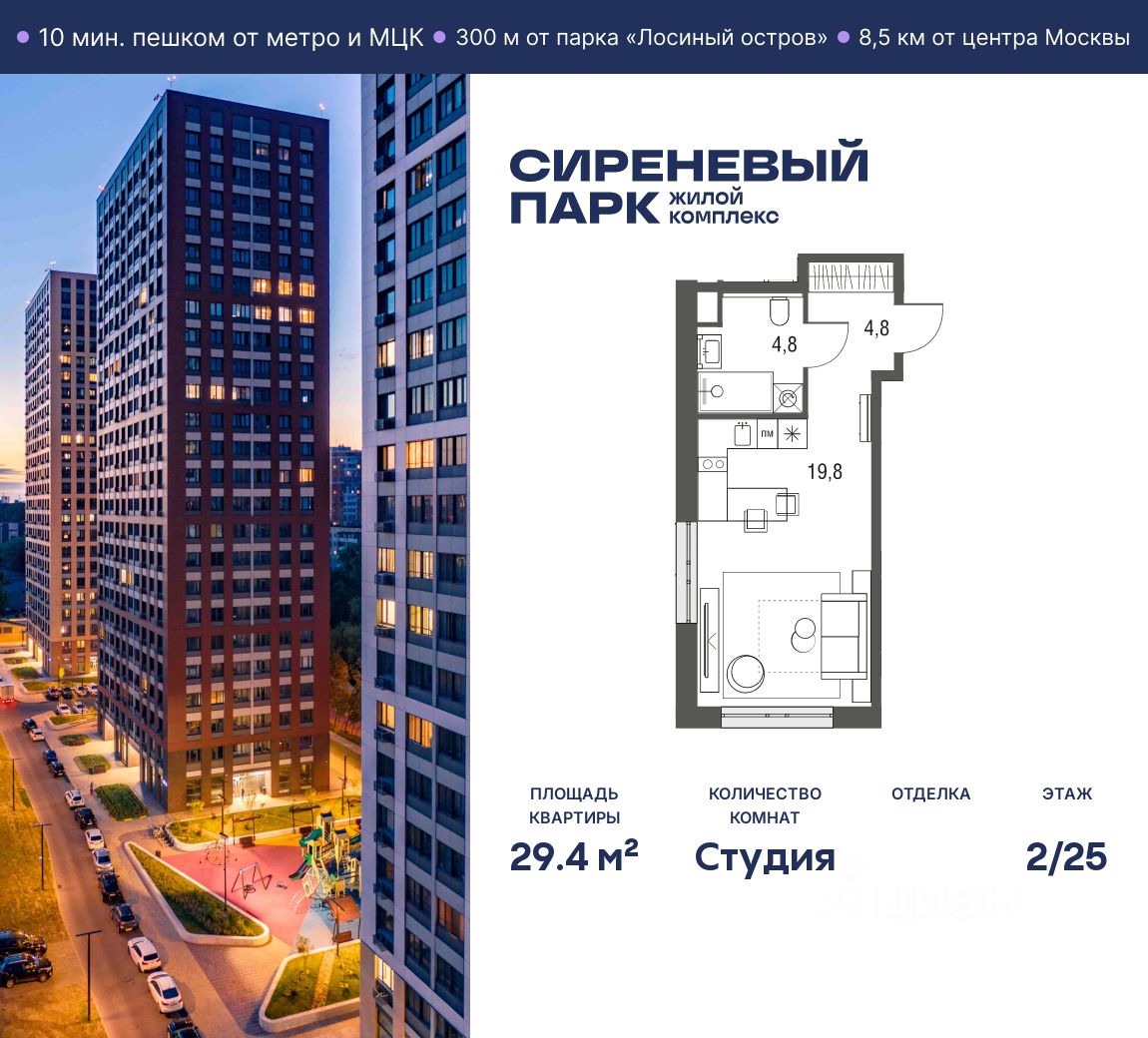 Продаётся просторная студия общей площадью 29.4 м² на 2 этаже в новом жилом комплексе "Сиреневый парк", расположенном в Восточном административном округе Москвы на улице Тагильская. Всего 10 минут ходьбы от станции метро "Бульвар Рокоссовского" и одноимённой платформы МЦК.
