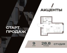 Смарт-студия для молодых специалистов или тех, кто ценит личное пространство и независимость. -Свободная линейная планировка, где гармонично зонирована кухня и спальня -В квартире предусмотрено панорамное остекление -Возможность установки дополнительной перегородки для разделения -Вместительная система хранения в коридоре Смарт-студия подойдет тем, кто ищет функциональное и доступное жилье. Молодой район для жизни "Акценты" в классе бизнес-лайт — точка роста на севере Москвы. Он предлагает элегантные и строгие фасадные решения, авторский ландшафтный дизайн, а также функциональные и доступные по цене планировки. Проект находится в семи минутах пешком от станции метро "Лианозово" и одноименной МЦД-1. Добраться до МКАД можно будет за 10 минут на авто, а дорога до центра займет около 20 минут. Жилой комплекс, расположенный в районе Восточного Дегунино, предлагает развитую инфраструктуру для тех, кто ценит выбор. Он имеет удобный доступ не только к транспорту, но и к паркам, школам, садам, больницам и другим социальным объектам. В пешей доступности находятся 4 поликлиники, 5 школ, 6 детских садов, 3 бассейна и баскетбольная академия. Еще рядом есть несколько лесопарков: "Лианозово" с аттракционами и спортивными площадками для тенниса, волейбола и баскетбола, "Останкино" с конным клубом, прудом и пейнтбол-площадками. А "Северные Дубки" — это завораживающее пространство для прогулок под кронами вековых дубов, берез и лип. Кроме того, в районе не будет скучно и юным жителям. Можно оттачивать трюки в скейтпарке "Союз". Ловким и прыгучим советуем записаться в акробатический центр "Белка".