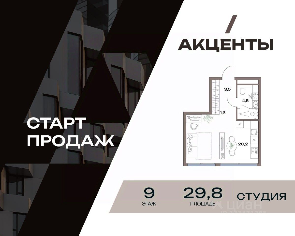 Смарт-студия для молодых специалистов или тех, кто ценит личное пространство и независимость. -В квартире предусмотрено классическое остекление -Вместительная ниша для хранения вещей в коридоре -Кухня-гостиная с грамотно зонированной кухней и зоной отдыха Смарт-студия подойдет тем, кто ищет функциональное и доступное жилье. Молодой район для жизни "Акценты" в классе бизнес-лайт — точка роста на севере Москвы. Он предлагает элегантные и строгие фасадные решения, авторский ландшафтный дизайн, а также функциональные и доступные по цене планировки. Проект находится в семи минутах пешком от станции метро "Лианозово" и одноименной МЦД-1. Добраться до МКАД можно будет за 10 минут на авто, а дорога до центра займет около 20 минут. Жилой комплекс, расположенный в районе Восточного Дегунино, предлагает развитую инфраструктуру для тех, кто ценит выбор. Он имеет удобный доступ не только к транспорту, но и к паркам, школам, садам, больницам и другим социальным объектам. В пешей доступности находятся 4 поликлиники, 5 школ, 6 детских садов, 3 бассейна и баскетбольная академия. Еще рядом есть несколько лесопарков: "Лианозово" с аттракционами и спортивными площадками для тенниса, волейбола и баскетбола, "Останкино" с конным клубом, прудом и пейнтбол-площадками. А "Северные Дубки" — это завораживающее пространство для прогулок под кронами вековых дубов, берез и лип. Кроме того, в районе не будет скучно и юным жителям. Можно оттачивать трюки в скейтпарке "Союз". Ловким и прыгучим советуем записаться в акробатический центр "Белка".