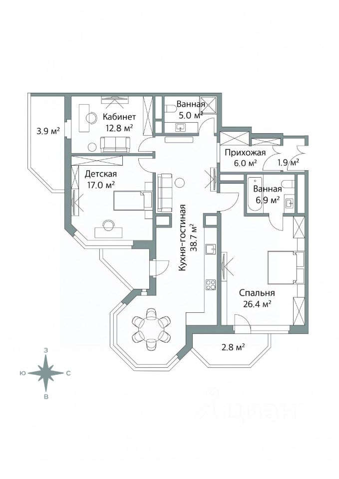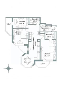 -кухня-гостиная с эркером и столовой зоной- 38,7 кв. м.;