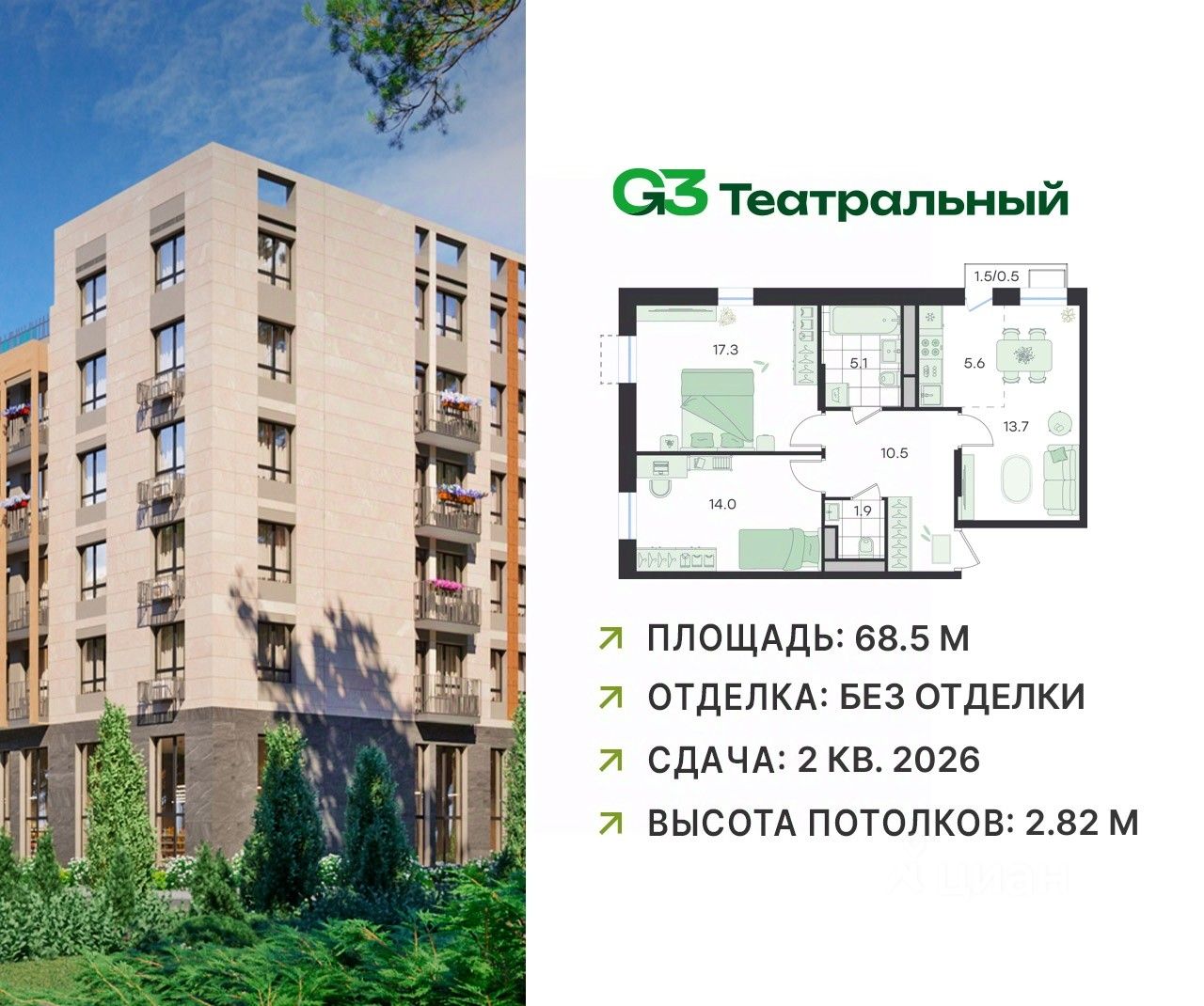 В современном квартале бизнес-класса G3 Театральный продаётся 2-комнатная квартира, общей площадью 68.5 кв.м, расположенная на 5 этаже (корпус 2, секция 2).