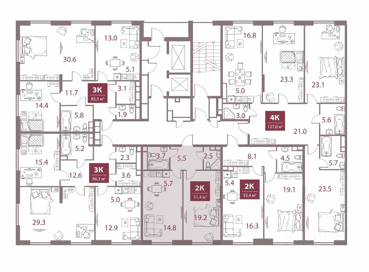 Площадь квартиры 51,4 м2 с прекрасной планировкой и лучшим расположением в ЖК по центру комплекса на 12 этаже (13 ти этажной секции) с выходом окон во двор.