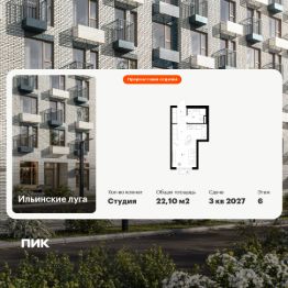 Продаётся квартира-студия площадью 22,1 кв.м на 6 этаже 9 этажного дома (Корпус 4.3, Секция 3) проекта ПИК Ильинские луга. Светлый просторный подъезд на уровне земли, функциональная планировка, большие окна, предчистовая отделка.