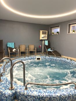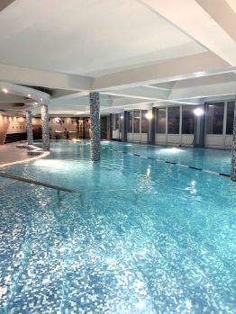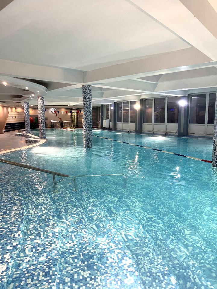 Бассейн (можно спуститься даже зимой в халате и тапочках): бассейн 25м, джакузи, сауна, групповые и индивидуальные занятия для взрослых и детей, аква-аэробика, несколько тренажеров.