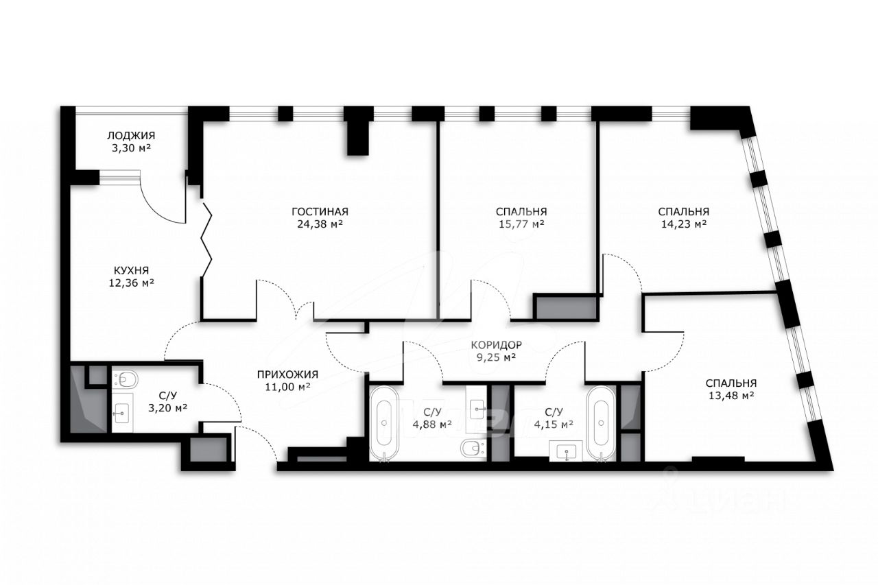 - Идеальная планировка с помещениями увеличенной площади: 3 отдельные комнаты, кухня-гостиная с выходом на балкон, гардеробная, просторный коридор. Три санузла