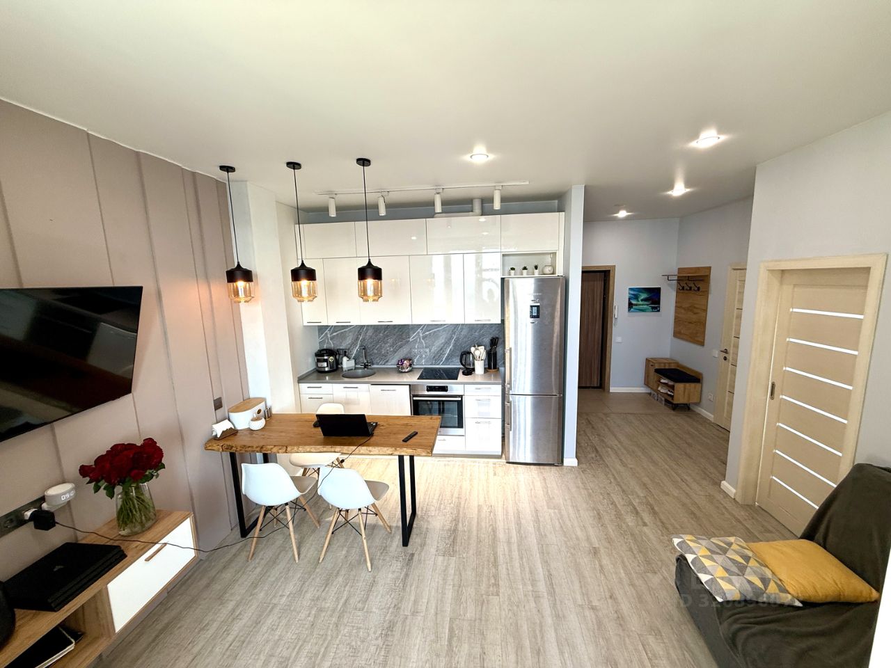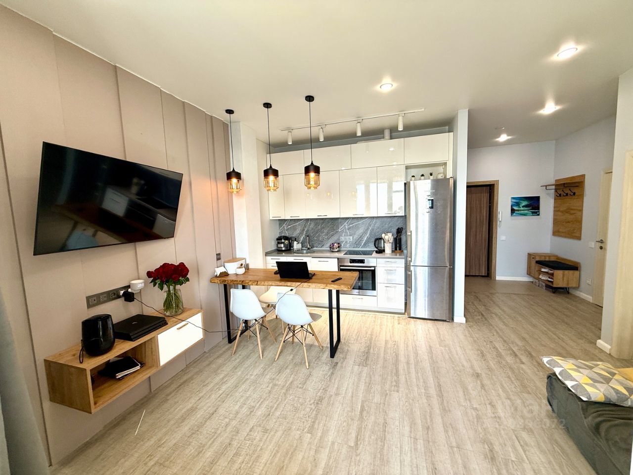 - Большая светлая гостиная совмещённая с кухней и обеденной зоной 17,4 м2,