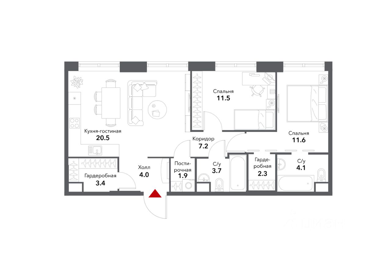 • мастер-зону: приватное пространство со спальней 11,7 м², собственной ванной (4,1 м²) и гардеробной (3,5 м²)