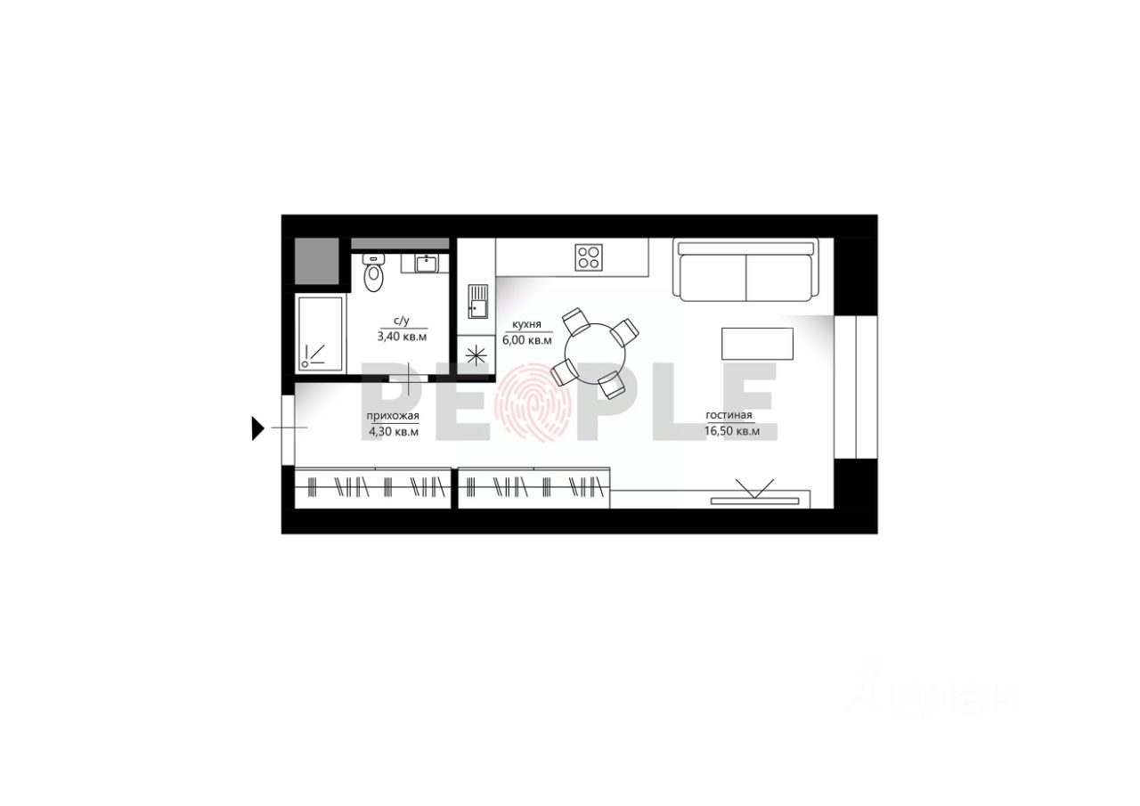 Единое пространство, которое легко зонируется на кухонную, спальную и рабочую зоны.
