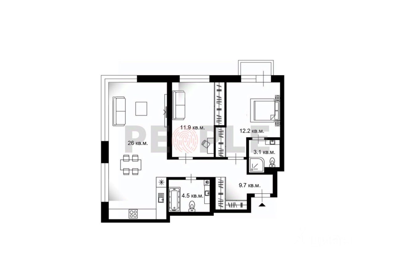 - Мастер-спальня 15,3 м² с собственным санузлом и выходом на балкон