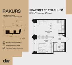 Продаётся 1-комнатная квартира 37.70 м² в жилом комплексе Ракурс. Квартиру отличают панорамное остекление, улучшенная шумо и воздухоизоляция. Дом сдаётся в 1 квартале 2028 года, продажи проходят через эскроусчета. Подземный паркинг, коворкинг, закрытая благоустроенная территория с фонтаном и артобъектами. Гибкие условия покупки.