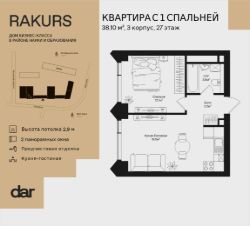 Продаётся 1-комнатная квартира 38.10 м² в жилом комплексе Ракурс. Квартиру отличают панорамное остекление, потолки 2,9 м, улучшенная шумо и воздухоизоляция. Дом сдаётся в 1 квартале 2028 года, продажи проходят через эскроусчета. Подземный паркинг, коворкинг, закрытая благоустроенная территория с фонтаном и артобъектами. Гибкие условия покупки.